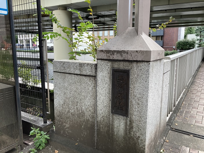 横を流れる日本橋川は、かって外堀川と呼ばれ、江戸城外郭に位置していました。そのため、現在も旧外堀石垣の一部が残され、この沿道にも一部石垣が残されています。また、橋のたもとには荷揚げ場として使われた痕跡が残っています。対岸にある鎌倉河岸は、江戸城築城資材などの荷揚げ場で、そのほか魚や青物のような生鮮食品をはじめ材木などの物資も集まり、近隣には青物市場など町人地が広がっていました。宮本公園に移築された、昭和2年(1927年)頃の建築の「遠藤家住宅」(千代田区指定文化財)は、江戸期以来鎌倉河岸で材木商を営んだ商家の建物です。