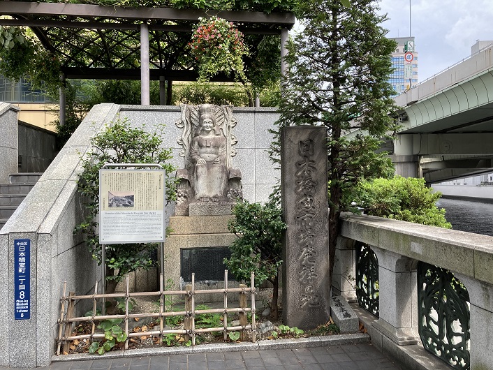 日本橋の東端に魚河岸跡の案内板と乙姫の像が置かれています。何で乙姫様の像かというと、龍宮城の住人である海の魚が舞い踊るごとく日本橋に集まったという意味を込めて選定したとのことです。