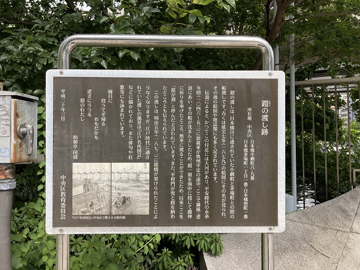 鎧の渡しは、日本橋川に通されていた小網町と茅場町との間の船渡しです。古くは延宝七年(一六七九年)の絵図にその名が見られ、その後の絵図や地誌類にも多く記されています。伝説によると、かつてこの付近には大河があり、平安時代の永承年間(一〇四六年〜一〇五三年)に源義家が奥州平定の途中、ここで暴風・逆浪にあい、その船が沈まんとしたため、鎧一領を海中に投じて龍神に祈りを奉げたところ、無事に渡ることができたため、以来ここを「鎧が淵」と呼んだと言われています。また、平将門が兜と鎧を納めたところとも伝えられています。この渡しは、明治五年(一八七二年)に鎧橋が架けられたことによりなくなりますが、江戸時代に通されていた渡しの風景は『江戸名所図会」などに描かれており、また俳句や狂歌等にも詠まれています。