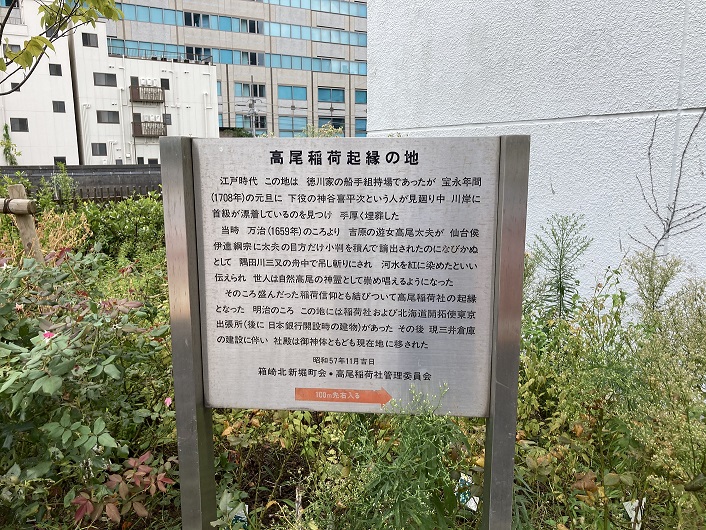 江戸時代、この地は徳川家の船手組持場であったが、宝永年間(1708年)の元旦に下役の神谷喜平次という人が見廻り中に川岸に首級が漂着しているのを見つけ、手厚く埋葬した。当時、万治2年(1659年)のころより吉原の遊女高尾太夫が仙台候伊達綱宗に太夫の目方だけ小判を積んで請出されたのになびかぬとして隅田川三又の舟中で吊し斬りにされ、河水を紅に染めたといい伝えられ、世人は自然高尾の神霊として崇め唱えるようになった。そのころ盛んだった稲荷信仰とも結びついて高尾稲荷社の起縁となった。明治のころ、この地には稲荷社および北海道開拓使東京出張所(後に日本銀行開設時の建物)があり、その後現三井倉庫の建設に伴い社殿は御神体ともども現在地に移された。