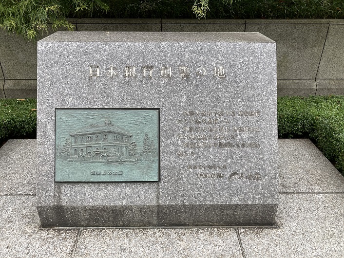神社の先の歩道の脇に小さな石碑が置いてありました。日本銀行は都心から外れたこんな場所で創業したんですね。それにしても簡素な碑文です。
