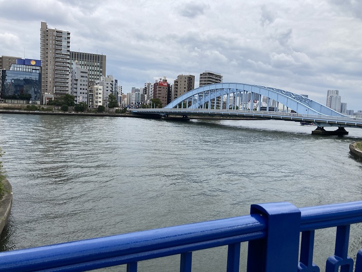 ようやっと隅田川との合流地点に架かる豊海橋にやってきました。橋のすぐ先には隅田川が迫っています。日本橋川は、上流・中流域では汚れたキ市河川でしたが、ここでは隅田川によって薄められたのか、水質はそんなにひどくはありません。やはり東京を代表する川は隅田川ですね。