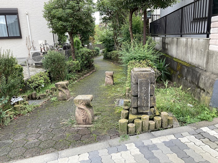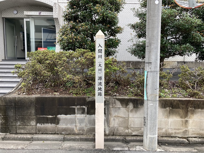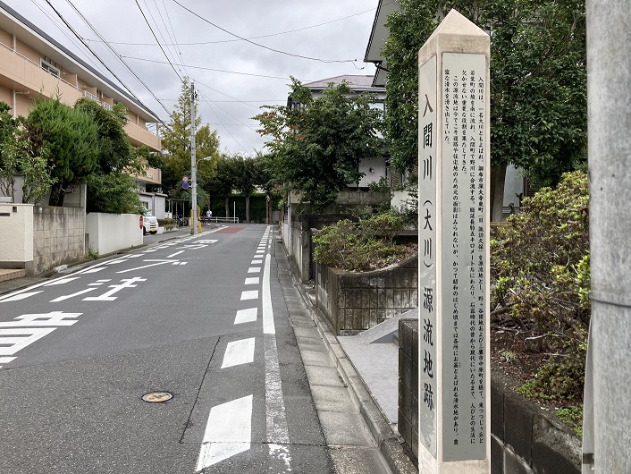 航空研とは、宇宙航空研究開発機構(JAXA:Japan Aerospace Exploration Agency)の略称です。何故JAEAでないかというと、国立研究開発法人日本原子力研究開発機構の略称がJAEAなので、重ならないようにしたのではないかと推測します。それはさておき、三鷹通りを渡って都営住宅の2つ先の道路のT字路に入間川の源泉を示した案内柱が立っていました。案内柱の正面には、地元での呼び名である「大川」源流地跡と大きく書いてありました。左右の細い柱面には入間川の歴史が書いてありました。結構小さな文字なので、近づいてみないと読み取れません。