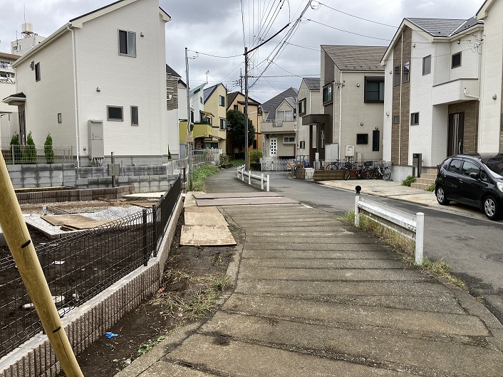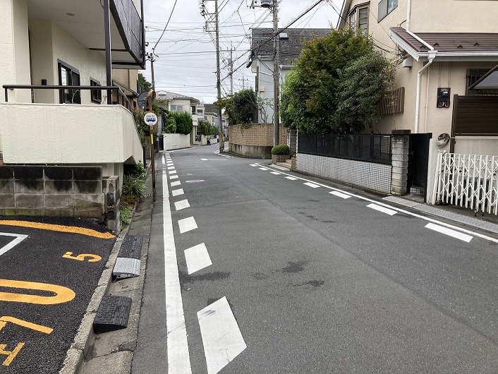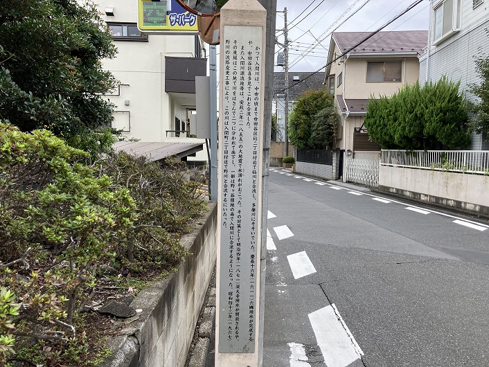 案内柱は野ケ谷通りに面して立っています。恐らく、入間川はここから現在の野ケ谷通りに沿って流路を形成していたのではないかと思います。ただ、今では流路の跡は住宅地の道路となっていて、微妙にカーブした道筋以外にそれと感じさせるものはありません。