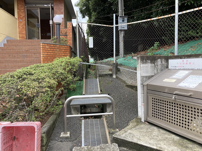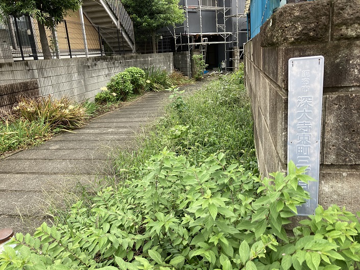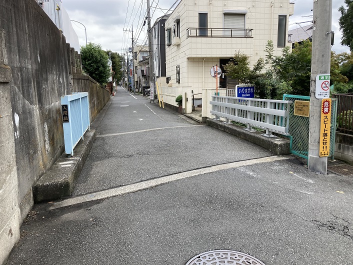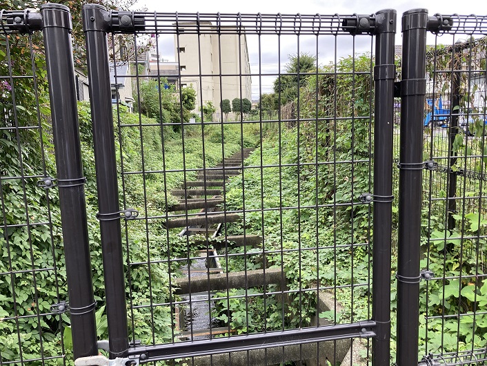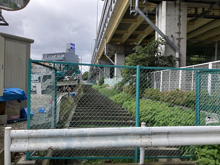 暗渠道は住宅の裏手を通ったり、道路脇の歩道となったりして中央自動車道の高架下まで延びています。