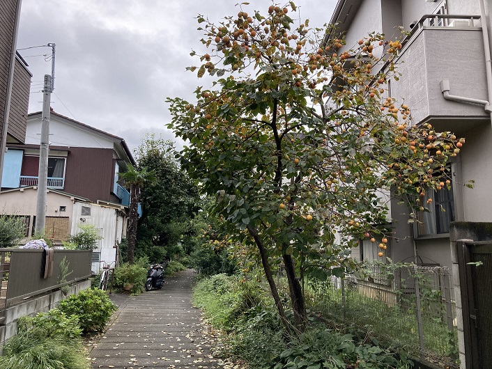 野ケ谷通りは原山交差点で原山通りに突き当たります。すると、今まで何の痕跡もなかった入間川が突然交差点の先に姿を現します。といっても、この地点では上部にコンクリートの板を被せた暗渠としてですが。暗渠道の傍らには柿の木がたわわに実をつけています。もうそんな季節になったんですね。