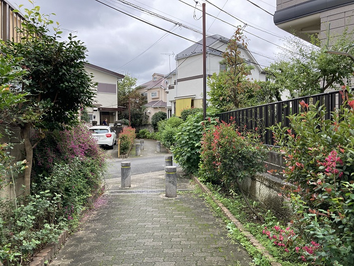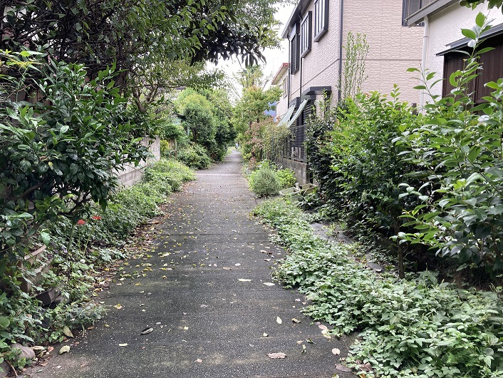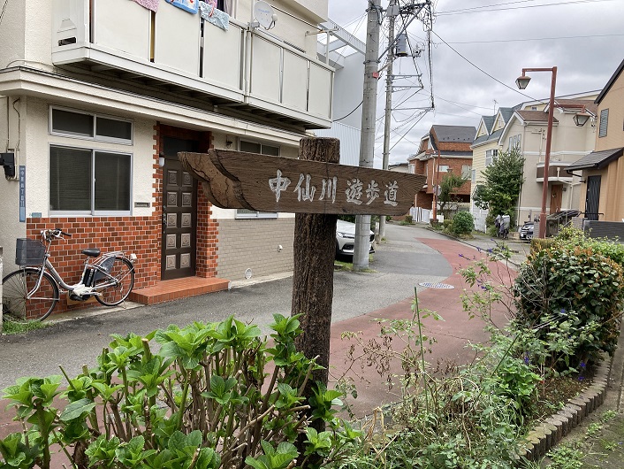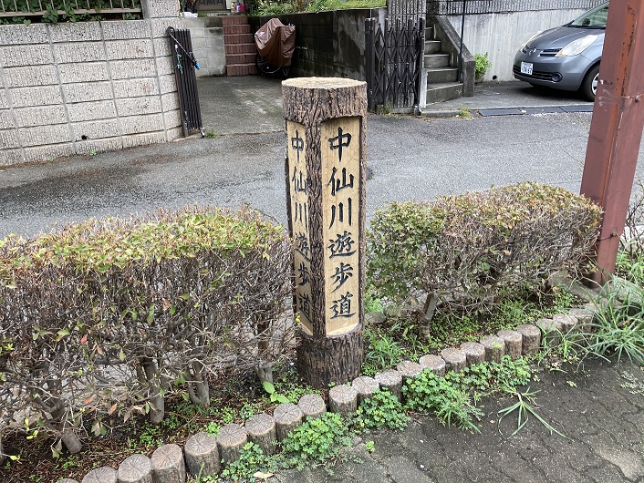 住宅と畑の間に待望の中仙川遊歩道の標識がありました。道路面はブロックで舗装されていて、いかにも遊歩道といった感じです。遊歩道の両側にはよく手入れされた植栽が続いていて、彩りを添えています。