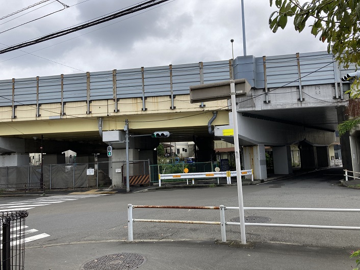 諦めて、今度は東の方を探します。こちらも路地の入り組んだ住宅地です。ぐるぐる回って中央自動車道の高架の近くに辿り着きましたら、ナント高架沿いに入間川が流れているではありませんか!ということは、さっきの高架下で入間川は直角に曲がり、高架に沿って東方向に流れを変えていたんですね。危うく入間川の歩きをここで諦めかけるところでした。