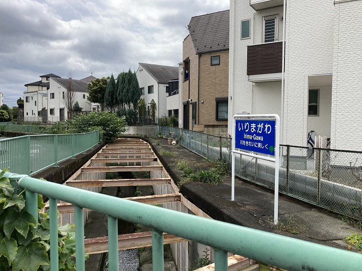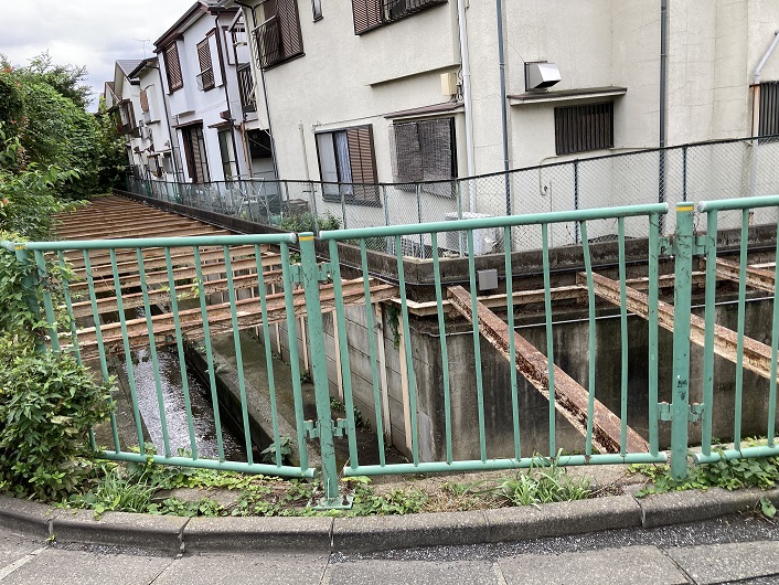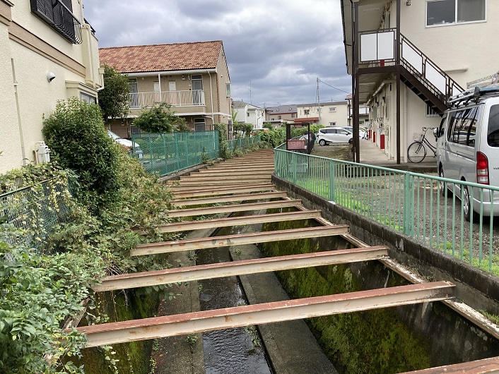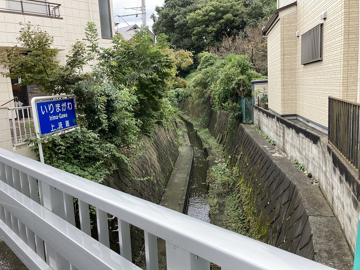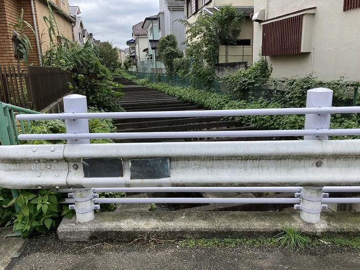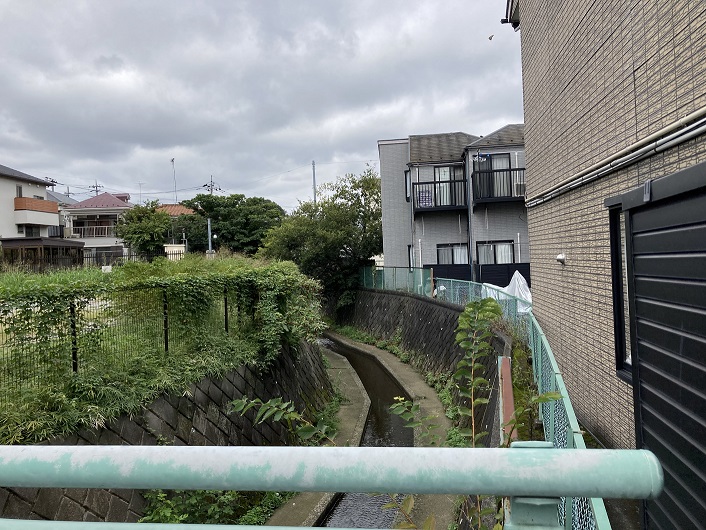 コンクリートで固められた川底には細い窪みがつけられ、大して流量のない水が流れています。両岸にはスレスレまで住宅が迫っていますが、大雨で増水したら恐怖でしょうね。