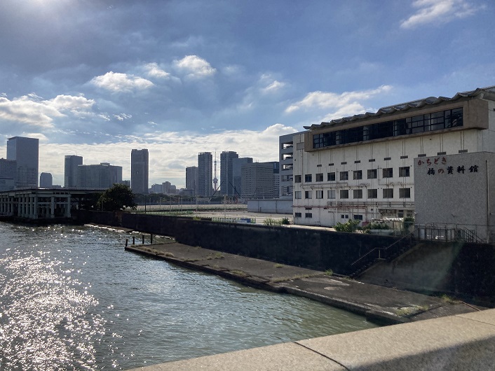 中央大橋の手前で隅田川はふたつに分流します。佃大橋方向へは隅田川本流、そして相生橋方向へは晴海運河となります。晴海運河の入口には大島川水門があります。