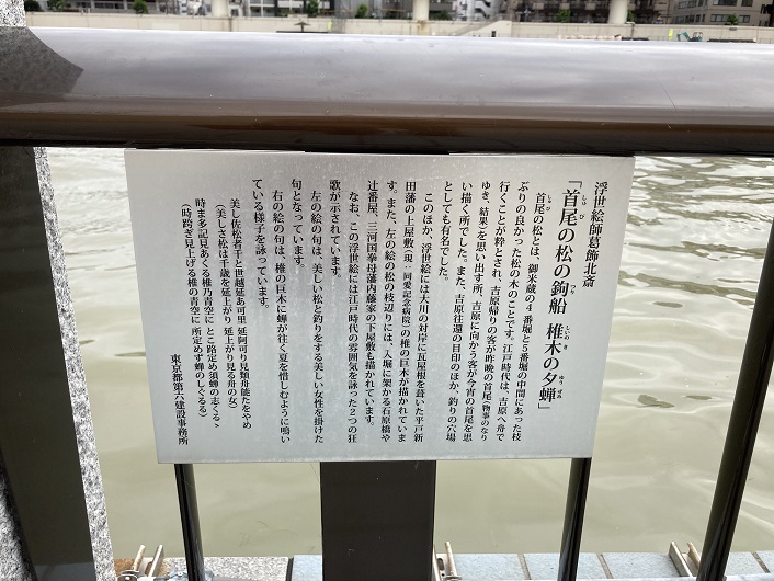 首尾の松とは、御米蔵の4番堀と5番堀の中間にあった枝ぶりの良かった松の木のことです。江戸時代は、吉原へ舟で行くことが粋とされ、吉原帰りの客が昨晩の首尾(物事のなりゆき、結果)を思い出す所、吉原に向かう客が今宵の首尾を思い描く所でした。また、吉原往還の目印のほか、釣りの穴場としても有名でした。このほか、浮世絵には大川の対岸に瓦屋根を葺いた平戸新田藩の上屋敷(現:同愛記念病院)の椎の巨木が描かれています。また、左の絵の松の枝辺りには、入堀に架かる石原橋や辻番屋、三河国拳母藩内藤家の下屋敷も描かれています。なお、この浮世絵には江戸時代の雰囲気を詠った2つの狂歌が示されています。左の絵の句は、美しい松と釣りをする美しい女性を掛けた句となっています。右の絵の句は、椎の巨木に蝉が往く夏を惜しむように鳴いている様子を詠っています。