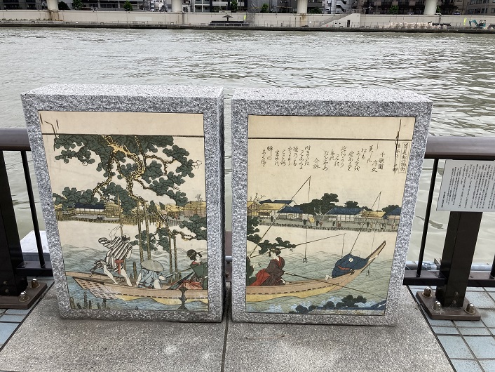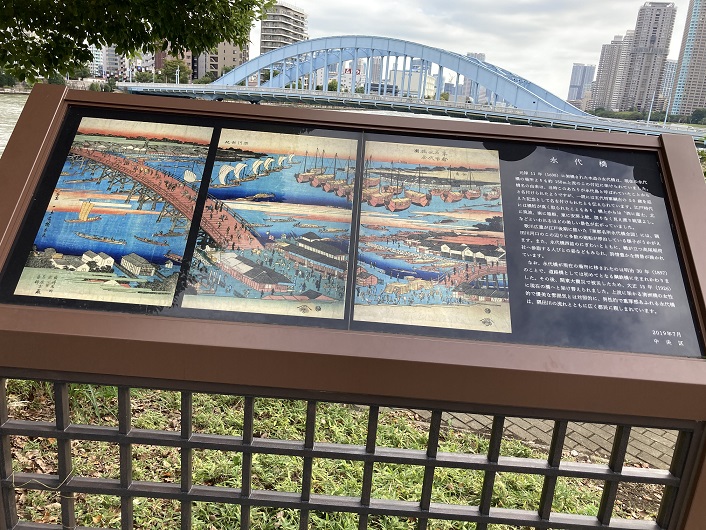 日本橋川が隅田川に合流する先に緩やかな弧を描いた永代橋が架かっています。その手前の箱崎河岸緑道の一画に、江戸時代の橋の風景を描いた絵と説明文を付した案内板が置かれていました。