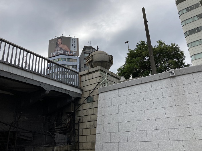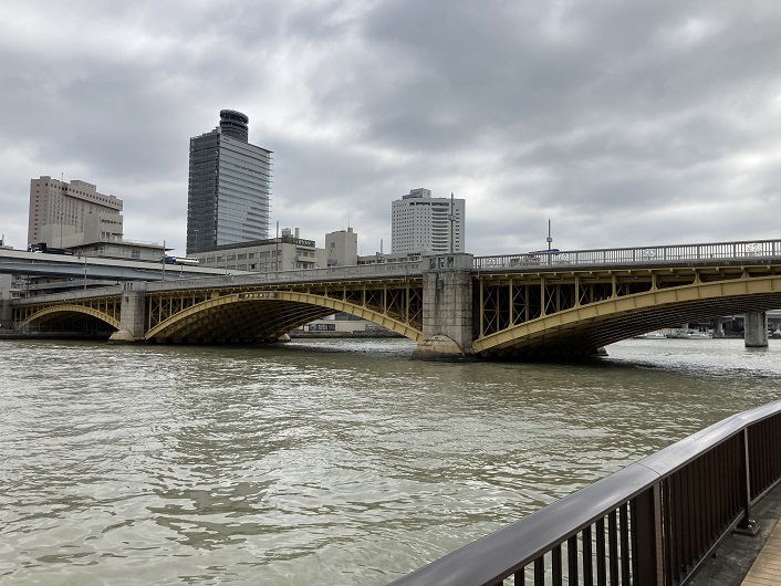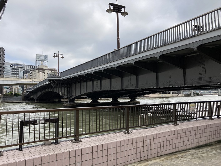 柳橋を渡って再び隅田川テラスに降ります。直ぐ先に両国橋が架かっています。親柱の上の丸い石のモニュメントが独特です。地球儀を模したものだそうです。両国の橋名は、最初に架けられた当時、武蔵国と下総国のふたつの国をつなぐ橋という意味から付けられたそうです。地球儀に四角い帯が巻き付いているのは、地球儀に描かれた国と国をつなぐ橋の意味もあるようです。