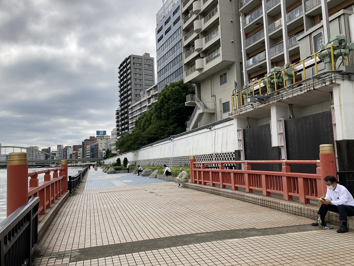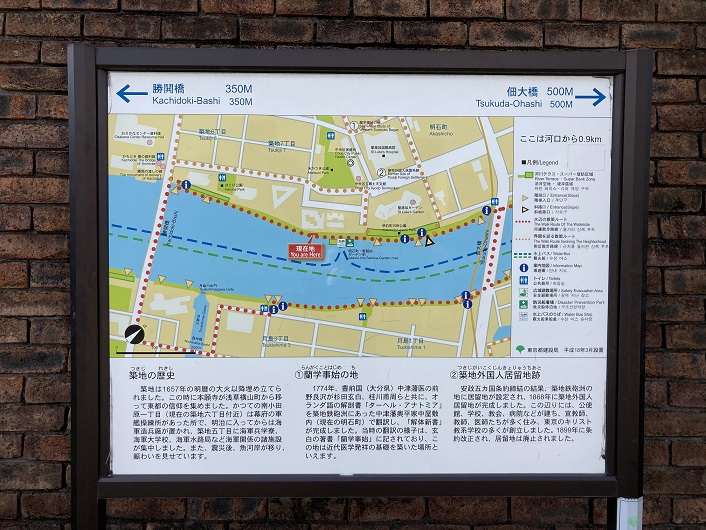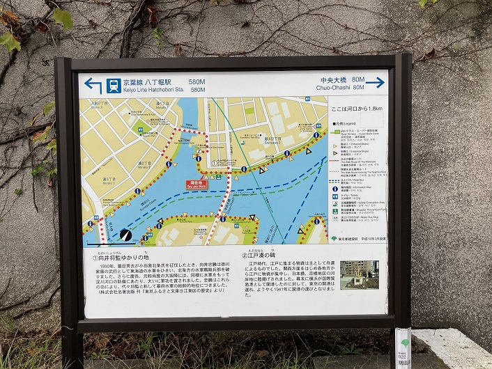 永代橋の袂に15番目の隅田川テラス周辺案内図があります。