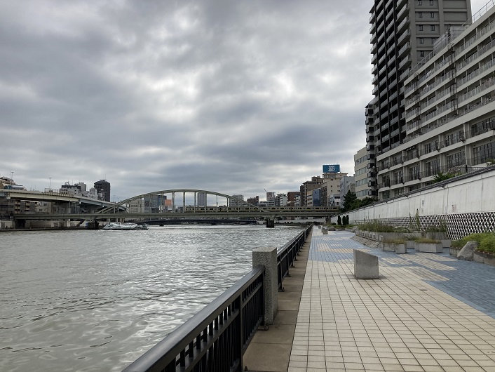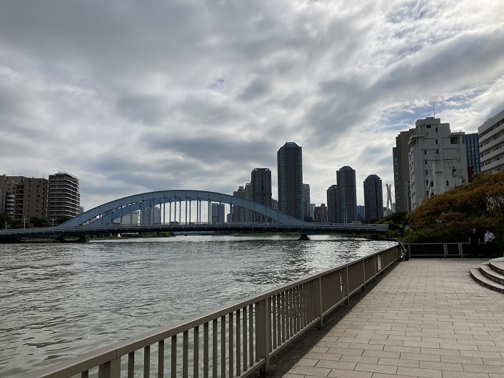 ひときわ高い支柱の橋は中央大橋です。1994年に開通した架橋で、隅田川に架かる橋で平成時代に初めて建造された新規の架橋です。夕刻から夜10時までは、白色の水銀灯と暖色系のカクテル光でライトアップされているそうです。私は見たことはありませんが。