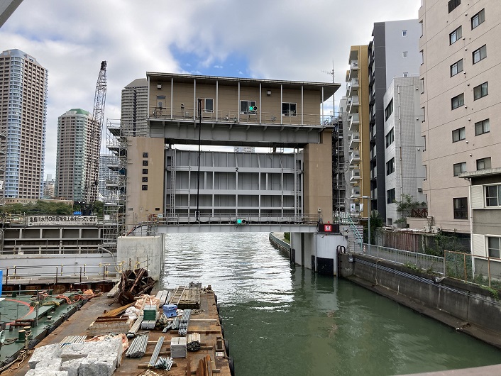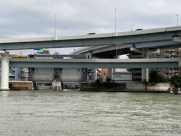 首都高6号向島線と首都高7号小松川線が分岐する直下に巨大な水門があります。堅川と隅田川を仕切る竪川水門です。