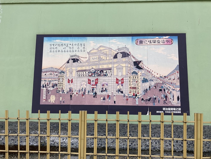 その先に浜町公園があります。土手に上がりますと、明治座が遠望できます。隅田川テラスの堤防の壁には、創建当時の明治座を描いた錦絵の巨大なレプリカが貼られています。菰樽と洋式の建物とのアンバランスが面白いですね。