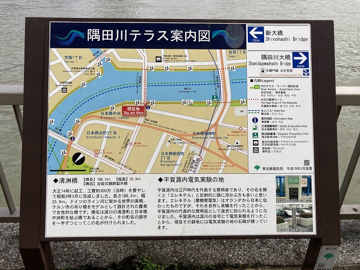 清洲橋の袂に12番目の隅田川テラス周辺案内図があります。