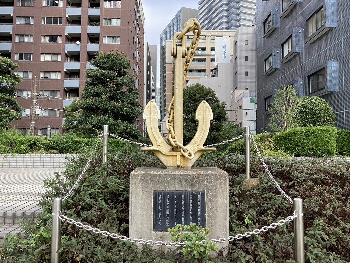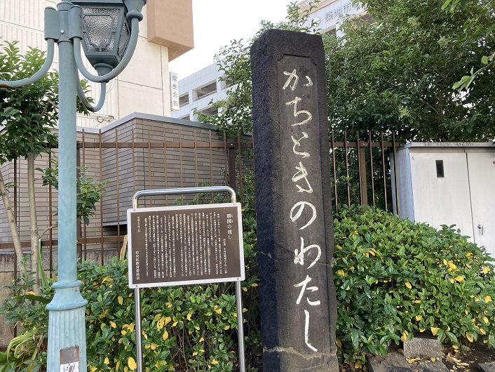 明治二十五年(一八九二年)、銀座・築地方面と月島との間には「月島の渡し」が開設されましたが、月島側の発展にともない、両地の交通はこれのみではさばけない状態でした。明治三十八年(一九〇五年)、日露戦争の旅順要塞(中国東北部)陷落を契機に、京橋区民の有志が「勝鬨の渡し」と名付けて渡船場を設置し、東京市に寄付しました。当地にある石碑は、この時に建てられた記念碑です。石碑の正面に「かちときのわたし」とあり、側面には「明治三十八年一月京橋區祝捷會挙行之日建之京橋區同志會」と陰刻されています。設置された勝鬨の渡しの渡船場は、ここから約一五〇メートル西の波除稲荷神社の辺りにありました。対岸にある月島側の渡船場は、月島西河岸通九丁目(現在の勝どき一・三丁目の境)の辺りにあって、この間を渡船が運航していました。勝鬨の渡しは、住民や月島の工場へ通う人々の重要な交通機関として大いに利用されていました。とくに、月島への労働人口の集中を容易にさせることになり、月島が工業地帯として発展する基となりました。大正十二年(一九二三年)の関東大震災後、架橋運動が起こり、船が通過する際に跳ね上がる可動橋が架せられることになりました。勝鬨の渡しは橋の架橋まで運航され、昭和十五年(一九四○年)六月、勝鬨橋の開通とともに廃止されました。勝鬨の渡しの名は橋名に受け継がれて今もその名を残しています。