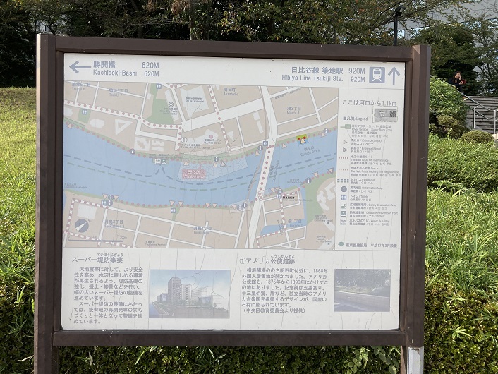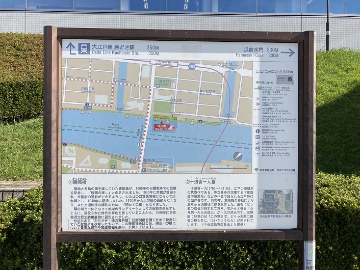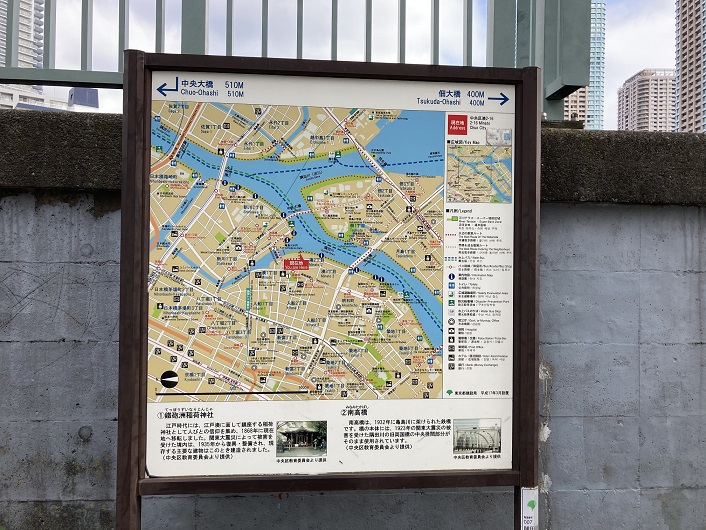 勝鬨橋の左岸袂に21番目の隅田川テラス周辺案内図があります。