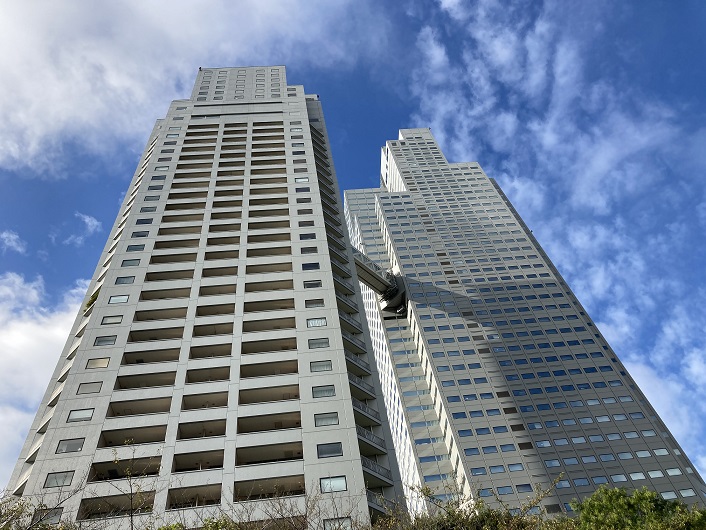 隅田川テラスから見上げると、隅田川を見下ろすように2棟の高層ビルが建っています。2棟まとめて聖路加ガーデンとなっていますが、片方はレジデンスでもう一方はオフィスビルになっています。レジデンスといっても普通のマンションではなく、有料の老人ホームらしいです。また、32階−38階にはホテルが入っています。レジデンスとオフィスビルを地上100mの渡り廊下で結ぶ理由が分かりません。そもそも性格の異なるビル間で渡り廊下を使って行き来する人なんているのでしょうか?火災時の避難用?