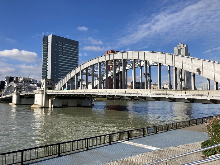 隅田川大橋は、首都高速道路(9号線)と都道47号線が重なった2段構造の橋となっており、上段部分が首都高速道路の高架橋、下段部分がいわゆる“隅田川大橋”です。また、地下に東京地下鉄半蔵門線が通っています。昭和54年(1979年)に完成したこの橋は、京浜・京葉地帯を結ぶ湾岸道路に通じ、隅田川に架かる橋のうち唯一の2階建ての珍しい橋です。
