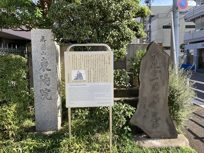 十辺舎一九(1765年〜1831年)は、江戸の滑稽本の代表作である、弥次喜多の活躍する「東海道中膝栗毛」などの作品で知られる江戸時代の戯作者です。1930年、東陽院の移転により浅草から現在地に移されました。墓石には5名の戒名が刻まれており、右から2番目「心月院一九日光信士」が一九の戒名です。左側面に辞世の句「この世をば、どりゃお暇に線香の煙と共に、はいさようなら」が刻まれています。