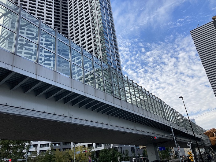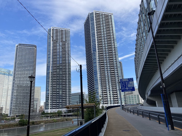 再び新島橋に戻って、新月島川と平行して延びる開通したての環状第2号線を朝潮運河との合流点に向って進みます。これも完成したての築地大橋から高架で繋がっていますが、高架部分の側壁は板ガラスになっていて、お洒落な街の雰囲気に溶け込んでいます。高架下の歩道は朝潮運河に向って上り坂になっていて、その先の晴海地区には超高層マンションが林立しています。2020年東京オリンピックの開催で、殺風景な空き地が広がっていた晴海は激変しましたね。