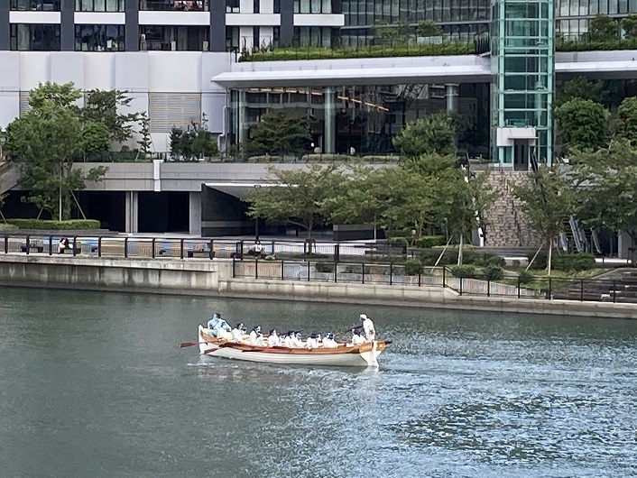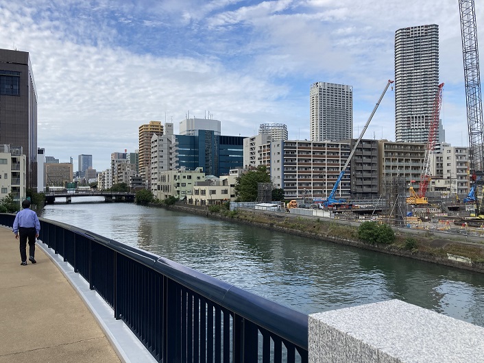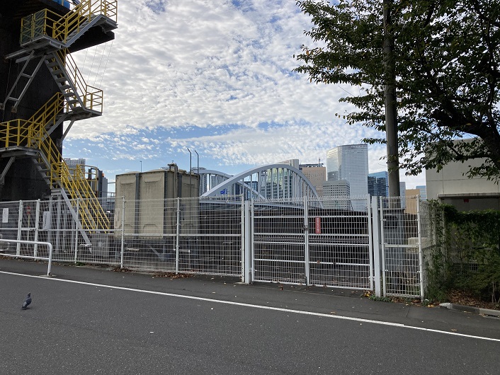 勝どきと晴海の間の朝潮運河には環状2号線を通す黎明大橋が新たに架けられました。黎明という名前は北朝鮮の平壌にある高層住宅街の通りの名称にもなっているそうです。まさかその名称をパクったわけではないでしょうけど。黎明大橋の入口付近がちょうど新月島川と朝潮運河の合流点横になります。朝潮運河には大学の部活でしょうか、一艘のボートが浮かんでいます。艇長の話を聞いているようにも見えます。そんなに密集してコロナは大丈夫なのでしょうか?