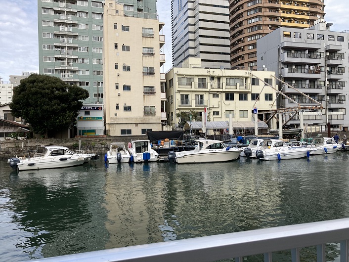 浜前水門の前には浜前橋が架かっていて、ここが新月島川の事実上の終点になります。橋の内側はマリーナになっていて、ヨットが係留されています。誰が乗るんですかね?