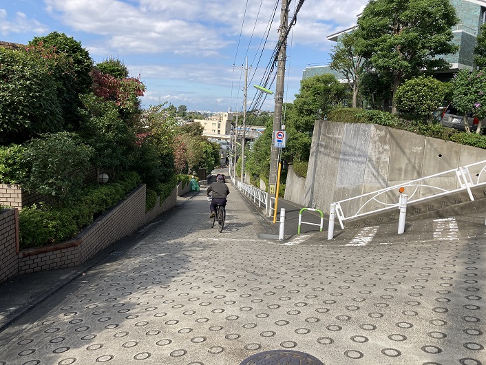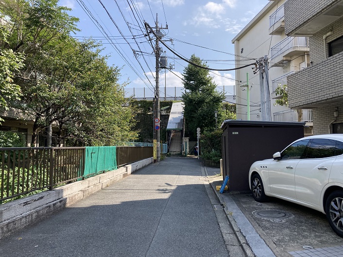 なるほど、世田谷区岡本三丁目の東名高速道路下の湧水と大蔵住宅内の池から流れる小川が源流だったんですか。今回、大蔵住宅からの流れは割愛して、岡本三丁目を始点として歩くことにします。岡本三丁目の西端は東名高速道路に接しています。ただ、その境界線には歩道がありません。そんな訳で岡本三丁目の地名が貼り付けてある電柱近くを源泉としたのですが、これは間違っていたようです。岡本3丁目の高台は、崖の斜面に住宅やマンションが建ち並んでいて、恐らくは国分寺崖線(ハケ)の一部なのでしょうけど、東名高速道路下の湧水を流すには地形的に無理があります。ということは後で分かったので、とりあえず急な坂を下ります。