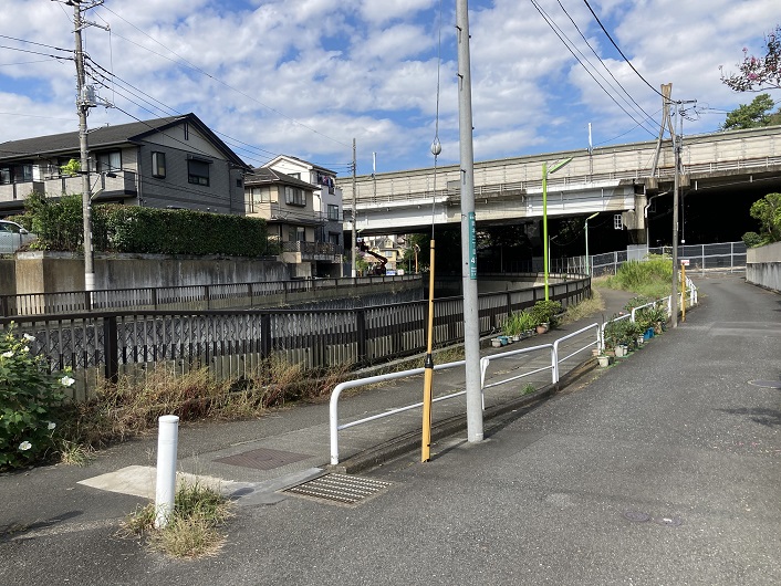 更に丸子川沿いに進んで行きますと、第三京浜道路の高架が見えてきます。新多摩川橋が近いためか、かなり高いところを通っています。