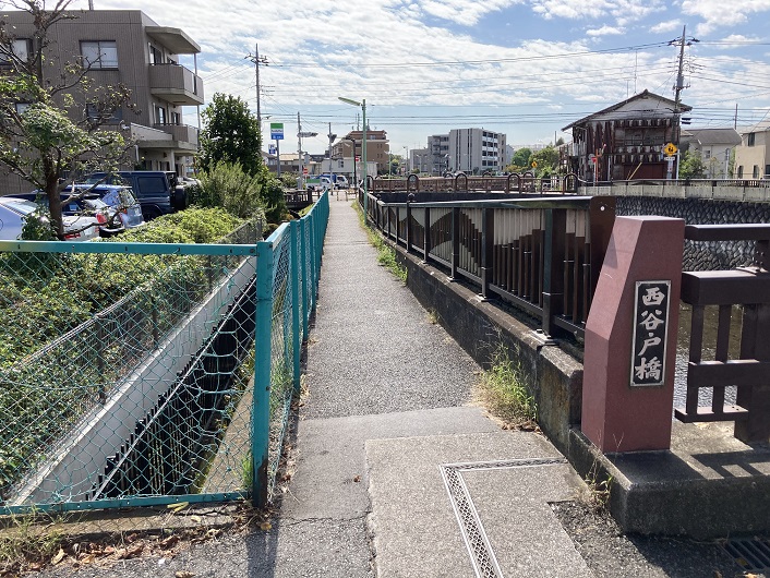丸子川は仙川に架かる西谷戸橋の横から開渠区間となり、水神橋付近で左にカーブして仙川の流れと分かれます。仙川はこの先で野川に合流します。一説によると、六郷用水は狛江市元和泉の多摩川から取水し、この水神橋付近で現在の丸子川に合流していたみたいです。六郷用水の中流部を整備して丸子川になったのか、あるいは元々あった丸子川の流路を利用して六郷用水の水路に造り替えたのか、どっちなのでしょうか?私は東名高速道路下の湧水と大蔵住宅内の池から流れる小川が丸子川の源流であるということからすると、後者の方が正しそうな気がするのですが。それはいいとして丸子川の歩きを続けます。