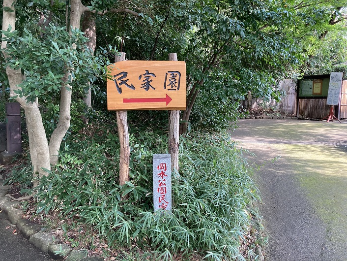 左手に樹木に覆われた森のような公園があります。岡本公園です。公園内には、江戸時代に建てられた建物を展示した民家園があり、旧長崎家住宅主屋と旧浦野家土蔵、それに旧横尾家住宅椀木門を復元し、江戸時代後期の典型的な農家の家屋敷を再現しています。近隣には岡本静嘉堂緑地もあり、緑豊かな地域になっています。