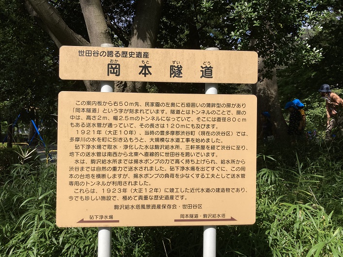 この案内板から右50m先、 民家園の左奥に石垣囲いの蒲鉾型の扉があり、「岡本隧道」という字が刻まれています。隧道とはトンネルのことで、扉の中は、高さ2m、幅2.5mのトンネルになっていて、そこには直径80cmもある送水管が通っていて、その長さは120mにも及びます。大正10年(1921年)、当時の豊多摩郡渋谷町(現在の渋谷区)では、多摩川の水を町に引き込もうと、大規模な水道工事を始めました。粘下浄水場で取水・浄化した水は駒沢給水所・三軒茶屋を経て渋谷に至り、地下の送水管は南西から北東へ直線的に世田谷を跨いでいます。水は、駒沢給水所までは揚水ポンプの力で高く持ち上げられ、給水所から渋谷までは自然の重力で送水されました。砧下浄水場を出てすぐに、この岡本の台地を横断しますが、揚水ポンプの負荷を少なくする工夫として送水管専用のトンネルが利用されました。これらは、大正12年(1923年)に竣工した近代水道の建造物であり、今でも珍しい施設で、極めて貴重な歴史遺産です。