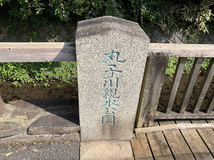 丸子川は、世田谷区及び大田区を流れる一級河川です。かつての六郷用水の中流部分が整備され、名称を変えて残っている川です。世田谷区岡本の仙川との接点が上流端であり、大蔵住宅と東名高速道路下の湧水が水源になっています。東名高速道路下の湧水は、岡本三丁目25番地にあります。湧水の量は豊富であり、東名高速道路沿いに細い側溝を流れるのを見ることができます。仙川にぶつかる手前でほぼ直角に曲がり、仙川護岸沿いに蓋付きの細い側溝を流れます。15mぐらいすると仙川護岸沿いにコンクリート蓋の暗渠になり、仙川の西谷戸橋付近からは開渠となって、水神橋付近で仙川から離れます。もう一つの水源は大蔵公園(大蔵住宅)の中にある池であり、池からは整備された小川が流れ(一部暗渠)、祠のある辺りで分流します。配管を通って仙川に落ちる流れと、丸子川に繋がる流れに分かれます。丸子川へはしばらく小川を流れてから仙川沿いの暗渠になり、上記の「コンクリート蓋の暗渠がはじまる辺り」で合流します。仙川の西谷戸橋付近から岡本公園付近は整備された丸子川親水公園として南東へ流れ、静嘉堂文庫の東側で谷戸川を合わせます。丸子川親水公園付近から先は、基本的に終端の田園調布まで国分寺崖線のふもとを進みます。さらに南東へ流れて二子玉川市街地の北を過ぎ、世田谷区野毛付近で北から流れてくる谷沢川に突き当たります。かつての六郷用水は谷沢川の上を横断していましたが、現在の丸子川はここで谷沢川に合流して、いったん途絶えます。この合流地点よりも下流の丸子川には、谷沢川から人工的に汲み上げた水を流しています。世田谷区玉堤・尾山台を通過した先の大田区田園調布五丁目には、用水の余水を多摩川に流す分水堰である「お鷹の圦(いり)堰」がありました。現在もこの場所には多摩川への分水路の水門が設置されています。さらにその下流の田園調布一丁目の多摩川浅間神社付近で多摩川に合流します。丸子川はここで終わりますが、六郷用水は現在の大田区の東部まで続いていました。