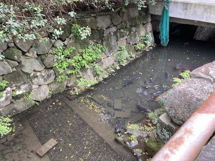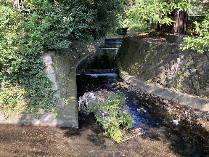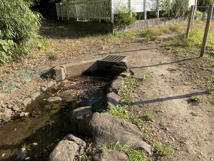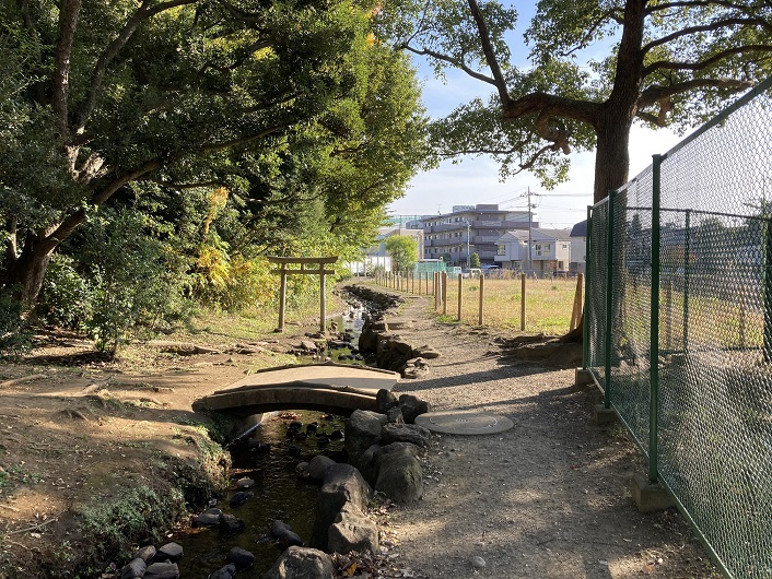 工事現場から地下を通って流れ出た小川は、さきほど見た神社方向に流れています。