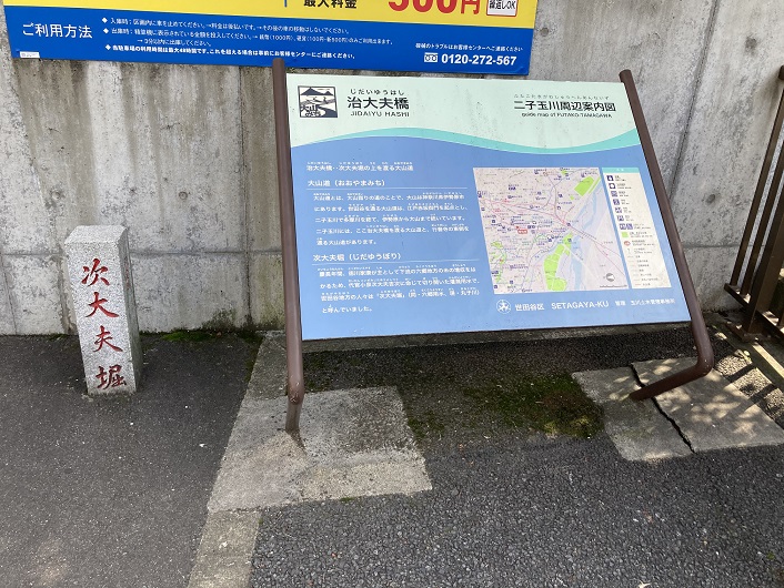 大山道とは、大山詣りの道のことで、大山は神奈川県伊勢原市にあります。世田谷を通る大山道は、江戸赤坂御門を起点とし、二子玉川で多摩川を経て、伊勢原から大山まで続いています。二子玉川には、ここ治大夫橋を渡る大山道と、行善寺の東側を通る大山道があります。