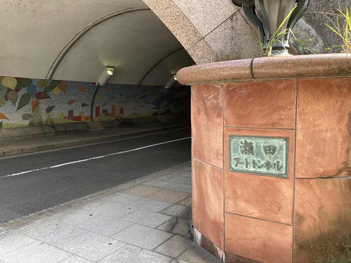 土手の左手を見ますと、土手下を貫くトンネルが見えます。こちらから反対側に抜けられそうです。瀬田アートトンネルという名前の付いた珍しいトンネルです。トンネルの内壁には現代的な装飾が描かれ、何ともお洒落です。こういう絵が描かれていると落書きがされないという話を聞きましたが、全くその通りです。さすが世田谷!