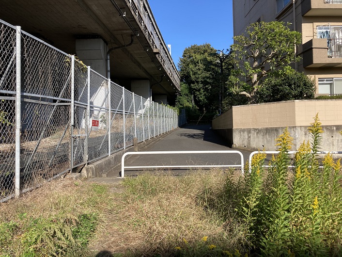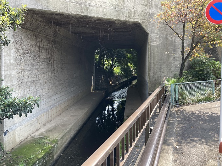 そのまま丸子川に沿って進んでいきますと、前方に国道246号線の土手にぶつかります。国道246号線には階段を上がって行けそうですが、国道246号線の土手下に掘られたトンネルに流れ込んでいる水路に辿り着けるかどうか分かりません。