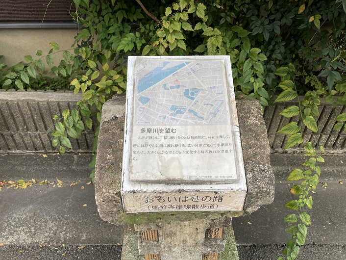 道路の脇に「おもいはせの路」と書かれた案内板があります。副題に国分寺崖線散歩道と添えられています。「おもいはせ」とは、「思いを馳せさせる」という意味です。世田谷区のHPには、「季節や時の流れとともに表情を変える、古代から現代までの様々な顔が見える路です。歴史におもいをはせるということから名付けられました。貴重な文化遺産を有する九品仏浄真寺から始まるルート上には、御岳山古墳や玉川野毛町公園内の野毛大塚古墳など古代からの遺跡が点在し、宇佐神社や善養寺、行善寺などの歴史ある寺社や祠が多く存在しています。また、23区唯一の渓谷である等々力渓谷や上野毛自然公園には、都会であることを忘れさせてくれる程の自然が残されています。最後は現代的な高層ビルの立ち並ぶ二子玉川駅まで歩く、6.7キロメートルのコースです。」と紹介されています。案内板の文章がかなり凝っていますね。