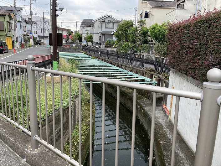 やがて丸子川は多摩堤通りの脇を流れるようになります。フェンスで遮られていますので、知らないとただの側溝のように見えます。