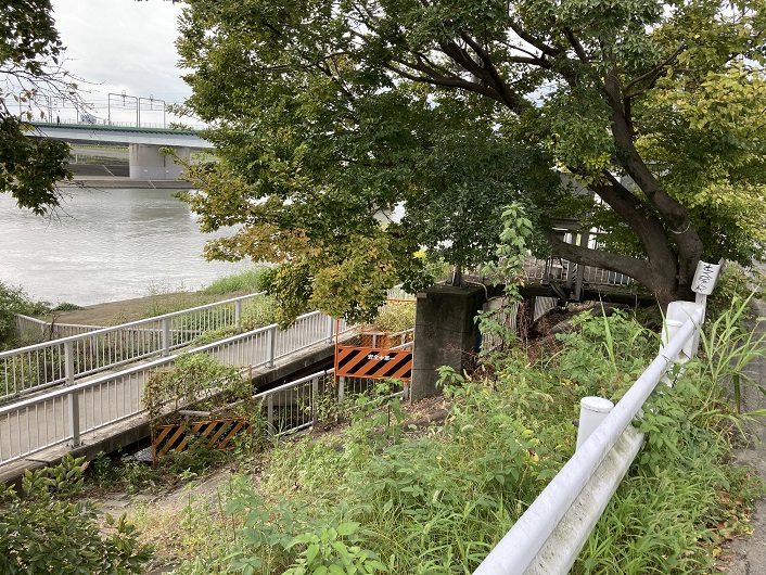よくよく見ますと、溜め池には出口となる水路があるみたいです。水路の両側には側道はありませんので、回り道をして水の流れる方向に歩いて行きますと、多摩堤通り手前の歩道に出ます。そこからさきほどの流路と思われるところに行きますと、そこも工事中となっていて、お鷹の圦堰からの流路の様子は確認できません。