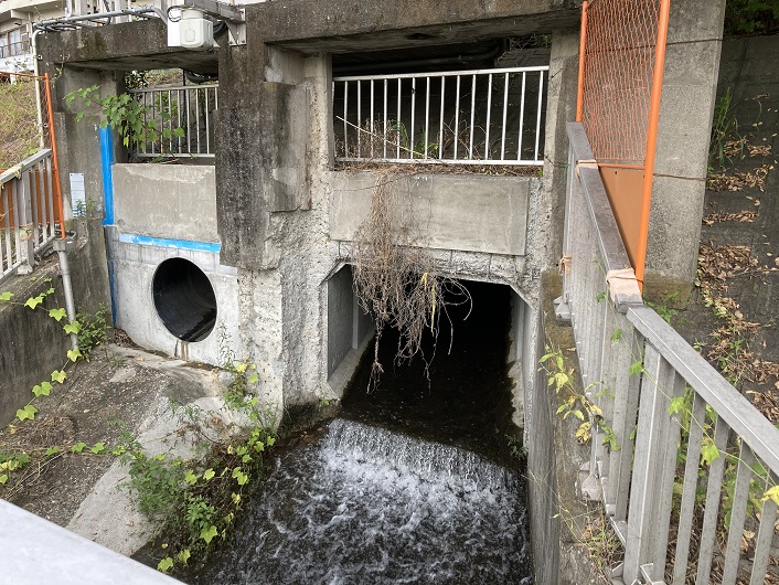 先ず、岡本三丁目の湧水の流路ですが、当初独断で決めた急坂の上の場所は誤りだったことが分かりました。東名高速道路の方から新打越橋に向って仙川沿いに延びてくるコンクリート蓋の暗渠が湧水の流路だったのです。新打越橋から直ぐの東名高速道路の土手下に行ってみますと、そこで暗渠は途切れ、代わりに直角に曲がった右手の側溝から水が流れてきています。つまり、国分寺崖線(ハケ)に沿って走る東名高速道路の土手から流れ出した湧水が側溝を伝って仙川にぶつかり、その手前で左直角に向きを変えて新打越橋の暗渠に繋がっていたわけです。側溝を覗いてみますと、ちゃんと水が流れています。