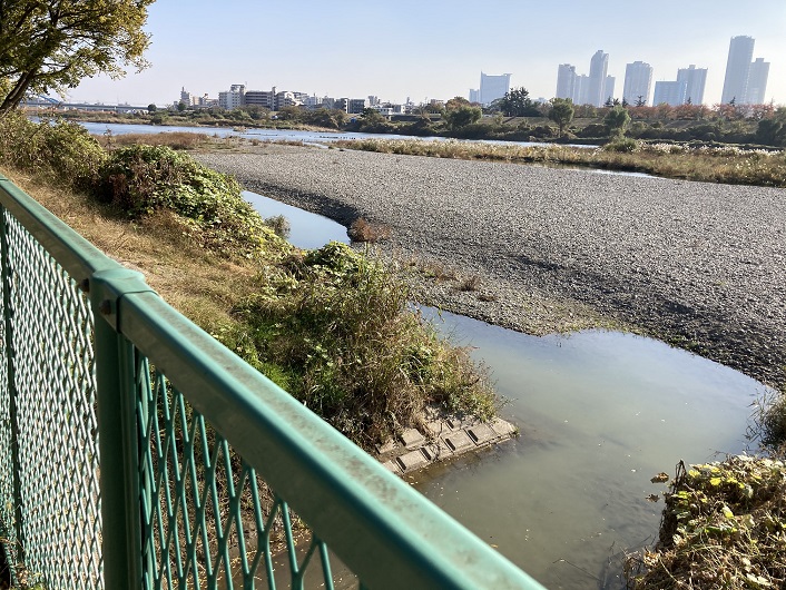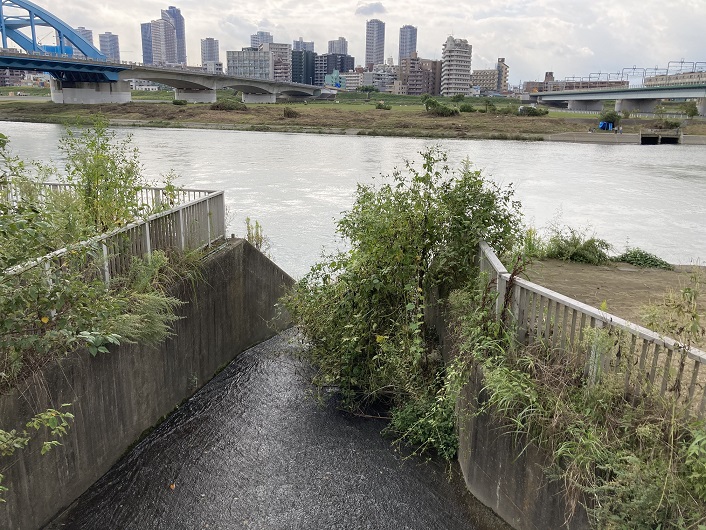 トンネルから流れ出た丸子川の水は導水路を通って多摩川に流れ込んでいます。ここが丸子川の河口となります。