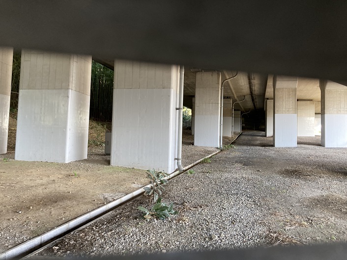 再々度歩いてみましたら、東名高速道路の土手からだけでなく、高架下の細い水路からも水が流れ込んでいることが分かりました。これも丸子川の水源のひとつでしょうか?