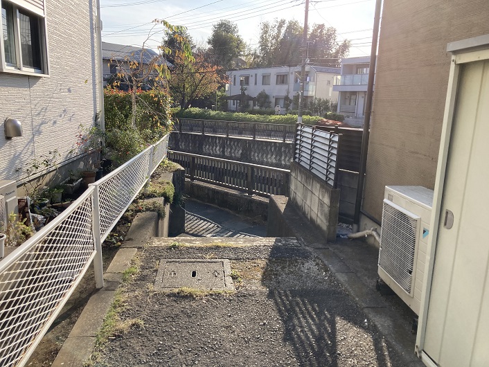 神社の小さな祠の先の暗渠の入口で小川は二手に分かれます。一方は仙川に流れ出しているとのことですが、もう一方は細い通路の地下に流れ込んでいます。通路は真っ直ぐに仙川の方角に延びています。