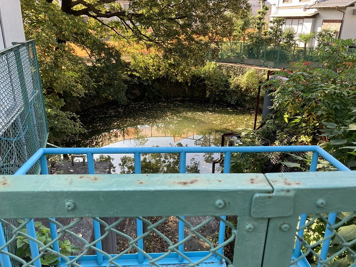 田園調布五丁目に鎮座する八幡神社の少し先の下流にお鷹の圦堰がありました。先日歩いた時はこの辺が工事中だったので、そちらに気を取られていたのかもしれません。脇の橋から見ると紛れもなく圦堰(水門の一種)が見えます。道路の反対側を見ますと、溜め池のようなところに濁った水が溜まっています。この水はどこに流れるのでしょうか?