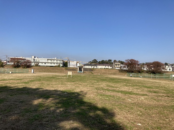 多摩堤通りを越えて多摩川の河川敷に下りますと、そこは広い運動場というか草地になっています。多摩川の縁まで行って振り返ると、何かの水利施設が見えます。恐らく、お鷹の圦堰で分流された丸子川の水は工事中だった箇所を通って多摩川の河川敷地下に流れ、多摩川に放流されているものと思います。なにはともあれ、これでお鷹の圦堰も確認でき、丸子川の歩きも完結しました。