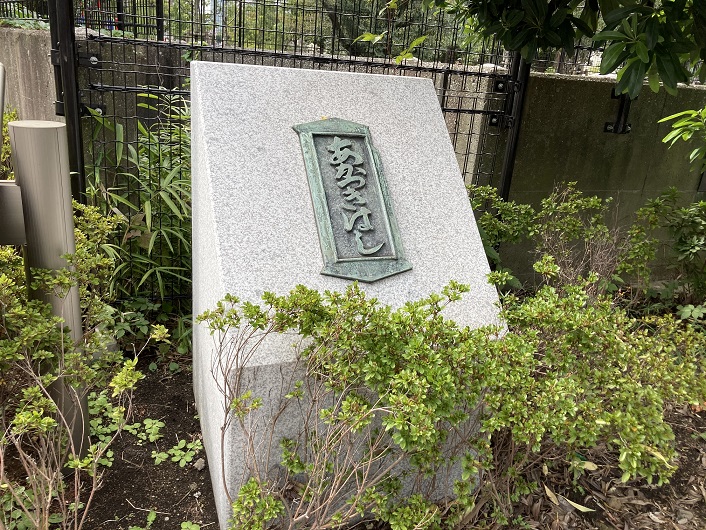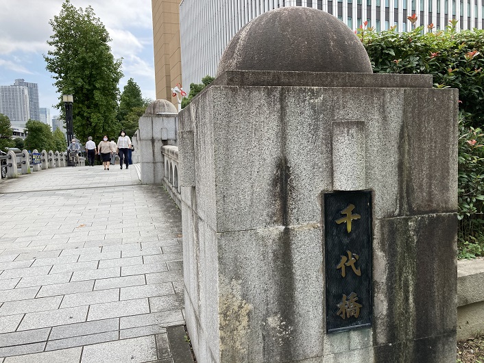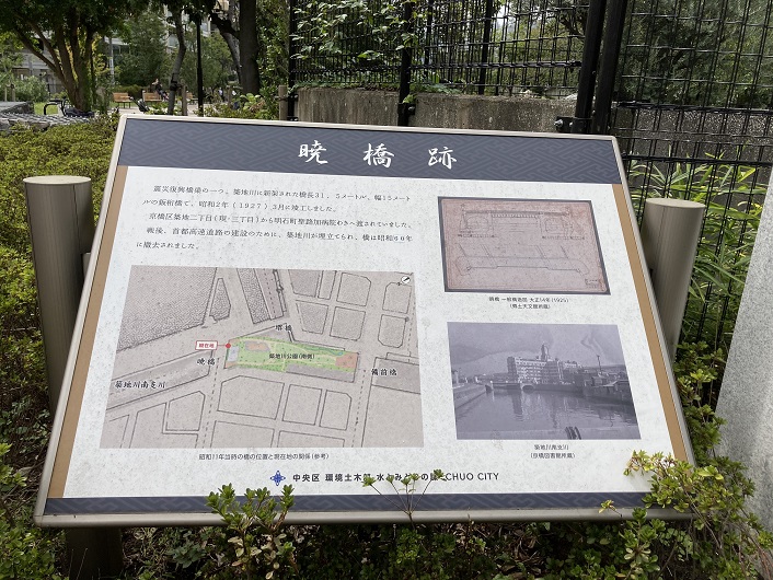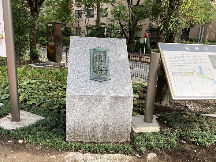 かってこの場所には築地川南支流(本流?)が流れ、震災復興橋梁のひとつであるラーメン橋台橋構造の暁橋が架かっていました。道路建設の都市計画決定に伴って、昭和46年(1971年)に築地川は埋立てられ、その後昭和60年(1985年)に暁橋は撤去されました。旧暁橋の橋銘板は、平成元年(1989年)に埋立てられ、平成元年(1989年)に開園した区立築地川公園の入口に設置されて以来、平成の時代を見守ってきました。